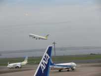 | 離陸して行きます。 いってらっしゃ〜い! さて、そろそろ時間ですから、モノレールの駅に向かいましょう。 羽田空港第2ビル駅から新整備場駅へは2駅。 |