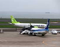 | 見慣れない機体が目の前を横切ります…あれは→…ソラシドエアらしいです。若草色の尾翼がプリティ☆ 1時間30分近く、昼食を摂りながら航空機の写真を撮っていました(笑)。 でも、奥の席の方々の多くは、私よりも前からいらっしゃっていて、まだ席にいらっしゃいました。このお店、もしかしたら回転率は…。 |