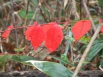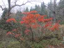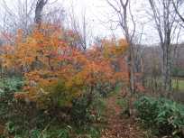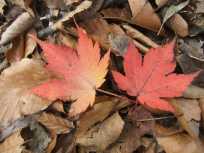 | 名残の紅葉を見ながら、落ちたてホヤホヤの落ち葉を踏みしめながら歩きます。まだ、ほとんど人に踏まれていない落ち葉たち。ちょっと「この葉っぱ踏むの、私がいっちば〜ん☆」な感覚だったりして…(笑) 普通に普通のいわゆる山道なイメージどおりの山道で歩き易い♪ |