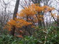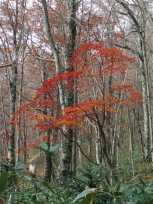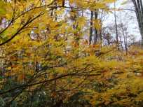 | ブナ林の中を落ち葉を踏みしめながら歩いていると、紅葉だけでなく黄葉にも出会いました。思い返してみると、鹿俣山は黄葉よりも紅葉の方が多かったような気がします。 この辺りでは、薄日が射していたりしました。 |