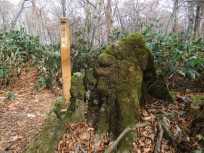 ←がテレビでも紹介されていたブナ地蔵です。歩いて来たゾ! ブナ地蔵からすぐにブナ平。 これからが、鹿俣山登山の本番なのここで休憩して栄養補給をします。倒木に腰掛けて行動食のバナナを頬張った途端、センターハウスからブナ平への最短距離の探鳥路から、ドヤドヤと20人くらいのおじさん、おばさんの団体が登場。うっわ〜!びっくり。慌てて残りを食べて、そそくさと荷物をまとめて出発。 |