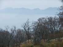 | 雲の上に山々が浮かんでいました〜! いきなり、思いもしなかったタイミングでの山々との邂逅にビックリ仰天。夢中で何回もカメラのシャッターを切っていました。 林の中を歩いていたときは全く気づかなかったのですけど、ゲレンデに出て視界が開けたのと、偶然、振り返ったのとで巡りあえた光景です。 |