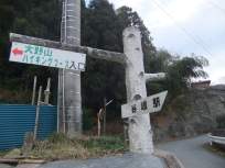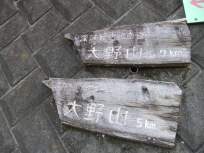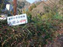 大野山入口バス停を降り、少し道を戻ると道路側壁に大野山への指導標が出現。ここから共和小学校を通り過ぎるところまで車道歩きが続きます。 指導標のなかには、→のようなお手製の可愛らしいものもあり、微笑ましくなりました。 |