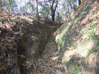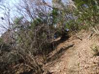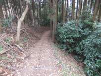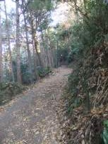 | エネルギー補充完了。元気に歩き出します。 ペース的に、途中で休憩中に目の前を通って行った3人組さんを追い越しました。 ←の狭まった道、→の開放的な道など、落葉した木々の間の明るい道を歩いて大野山山頂を目指します。 |