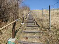 | 山道から雲ひとつない真っ青な空まで続くかのような遥かまで伸びる階段。思わず気が遠くなりかけました。大野山は山頂付近まで牧場になっているので、階段脇には牧場との境のフェンスがありました。冬なので牛さんたちはいませんでしたが、牛さんたちがいる季節だと牧歌的雰囲気が更に増すのでしょうね。 意を決して階段をひたすら上ります。 |