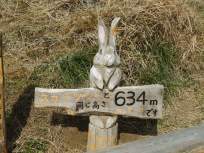| 「スカイツリーと同じ高さ634m」の表示を持つウサギさん。プリティ。これが造られたので2011年なので干支のウサギが持っているようです。 ここがスカイツリーと同じ高さですかぁ。改めて後ろの景色を振り返りました。 ハイキングコースの管理者さんか牧場の方か、設置された方は面白いことをなさいますね♪ |