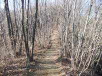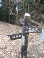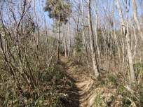 | 私、←こういう尾根道、大好きなんです〜♪ 2月の雪の時期だったので、積雪を心配していましたが、寒くてロウ梅の開花が遅れている割には、山には雪がほとんどありませんでした。それが意外と言えば意外。歩きやすくて助かりました。 野上峠から10分くらいで、一旦車道に出ます。 |