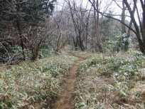 | 笹の生えた尾根道を歩いたり↓、木の階段を上ったり→、バラエティに富んだ山歩き。 | ||