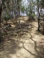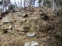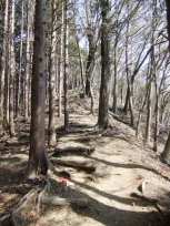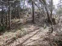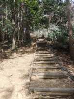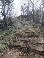 | 三沢峠で他の道から草戸山を目指して歩いて来た方々も合流して、一気に道を歩く人の数が増えました。 三沢峠から草戸山への道は、ものすごい急登あり、傾斜のキツイ階段ありでした。もし道を間違っていたらここを戻らなくてはならないなどと、ヘンな心配をしてしまい、思わず階段途中で地図を確認してしまいました。 |