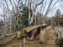 | 何気なく振り返った偶然で出逢えた金比羅山と力作のリュック掛け&テーブルとベンチ。南高尾山稜には、こうしたテーブルやベンチが多いのは、地元の皆さんのボランティア作品なのでしょうか。 ここから先は、前を見つつ、進行方向右側の山々にも注意を払って歩くようになりました。 |