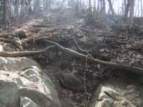 | ←の石と木の根の間を上ったり、→のような尾根道(?)を急降下したり、ウワサに違わず、南高尾山稜はアップダウンがたくさんあります。 でも、それだけではありません。 |