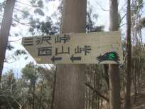 | 次のチェックポイントの西山峠へは、こんな←可愛らしい指導標に導かれて進みます。 この指導標に限らず、歩いていてより具体的でありがたい情報は、設置された指導標ではなく、手書きの指導標に書かれていることが多かった山域でした。 中沢峠から歩くこと10数分。 |