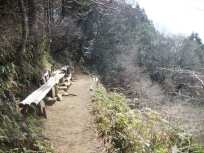 | 見晴台に到着。 一方の斜面の木が払われて眺望抜群の場所に、ご親切にベンチが置かれています。私がここに着いたときは、ご覧のとおり、どなたもいらっしゃらなかったのですが、私がここで写真を撮影していると、後方からお一方、前方からお二方が通りかかり、それぞれベンチに腰掛けて、眺望を楽しみました。 その眺望とは、↓。 |