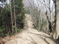 | 3月とはいえ、まだまだ冬山の様相を呈する山道を途中の西山峠までは“梅の木平”の指導標に従って歩きました。(西山峠で“梅の木平”の指導標に従うと梅の木平に下山してしまい、草戸山方向に行かないので要注意) 大垂水バス停から南高尾山稜最高峰である大洞山(標高536m)までの上りは結構きつかったです。これさえ上りきれば尾根歩きと、自分に言い聞かせながら上りました。 |