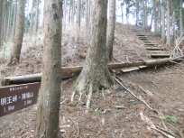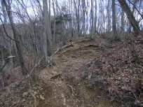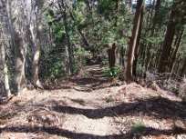 | 杉ノ丸もピークなので、上って到着したら下ります。 アップダウンがキツイと書かれていた面目躍如な急登・急降下が怒涛のようにこれでもかと押し寄せてきます。北高尾山稜、標高は堂所山が731m、関場峠が613m、杉の丸が612mと決して高くはないけれど、このアップダウンの連続は、いい鍛錬の場になります。 |