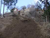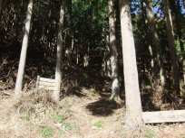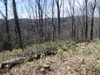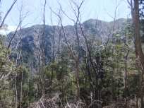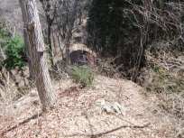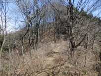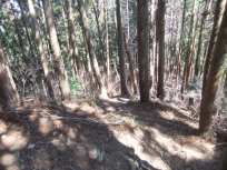 | 写真では→、ただ、木々と地面を写しているだけにしか思えないでしょうが、これが登山道です。これを下ります。ガーデン手袋を装着して、木や岩で体の重心の安定を確保して慎重に下ります。こういう所は、上りよりも下りの方が怖いのです。 慎重に慎重に下ってクリア。ここでホッとしたら危ないので気を引き締めないと。 |