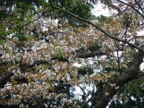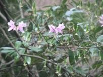 | 分岐に到着。ここで北高尾山稜のコースに合流です。 おやつタイムで休憩にします。 ←駒木野バス停方向から来て、→富士見台・八王子城山方向へ進みます。 →面白い花が咲いていました。花の周囲に笹の葉が…。 |