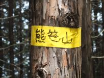 | この辺りから目に付くようになった笹がその数を増し、笹の中の道を進むことしばし…熊笹山山頂に到着。多分、熊笹山です。→手書きで熊笹山と書いてあるので、きっとそうです。テープにマジック書きでの表示、親しみが湧いてきます〜。 休憩したばかりなのと、この先の富士見台でランチタイムにする予定なので、ここでは休まずに進みます。 |