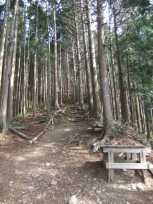 | 上りが一段落して尾根道になった辺りにベンチとテーブルがあったので、一休み。ここまで、かなりキツイです。 | ||