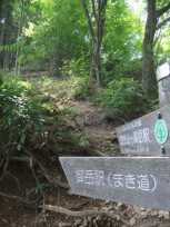 駅前に道標があるので、それを確認してから歩き出しました。 軍畑駅から少々歩くと道は2手に分かれています。そこを向かって左側の道へ。 軍畑駅から20分くらい歩いて、次は向かって右の道へ入ります。 地図と照らし合わせつつ、道標で確認して進路を取ります。好天で少し暑いくらいないい陽気。なのに、この辺りでは、他に山を目指して歩いている人はいませんでした。 |