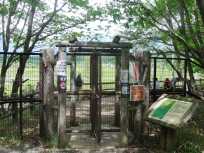 | 小田代原には、バス停、トイレ、休憩場所などがありました。 そして、小田代原に入るのにも鹿避けの柵を通ります。こちらは回転式。 柵の中に入るとベンチがありました。どのベンチにも人が座っていらっしゃったので、余裕のありそうなベンチの方に相席(相ベンチ?)をお願いして心よくOKをいただき休憩。小田代原の湿原を眺めながらのおやつタイムです。 |