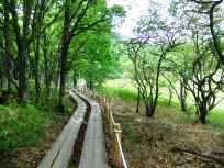 | 小田代原に来ると、アップダウンはほとんどなく木段をひたすら黙々と歩くのですけれど、この木段が足の裏にじわじわと効いてきて、だんだんと足の裏が痛くなるのです。足の裏の鍛え方が足りない? 小田代原のベンチを出て、しばらくすると同じ方向に向かうおじさま&おばさまのグループと抜きつ抜かれつな感じになりました。 |