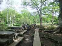 | 泉門池、水が綺麗ですし周囲の風情も私好み。しかも、たくさんテーブル&ベンチがセッティングされた絶好の休憩ポイントです。 はい、ここでも池と林と山を見ながらおやつタイム。こんなにおやつを食べているから山歩きしても体重は落ちない…。 |