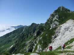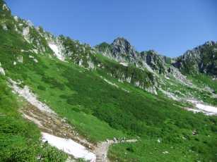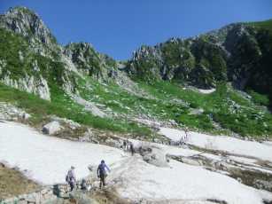 7月下旬の日本の本州に雪がある場所が残っている場所があるのですね〜。何だかスゴイなぁ〜。 軽アイゼンとかの用意はないので、普通の登山靴で慎重に滑らないように細心の注意を払って雪渓を渡ります。ちょっとヨチヨチ。夏の雪渓渡り初経験☆いえ、雪渓を歩いているときは、もし滑ったらか〜な〜り滑り落ちるので、とても緊張して歩いていました。 見る限り、軽アイゼンを使っている方はいらっしゃいませんでした。 |