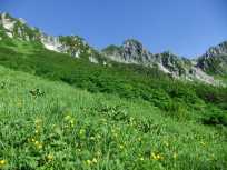 千畳敷カールの絶景が、どど〜ん!と目の前に広がっていました。 うきゃ〜!!!素敵☆ステキ♪ 蒼い空、緑の植物、そそり立つ中央アルプスの峰々。うっとり。 一気に舞い上がってしまって、浮かれ気分のままストレッチをして行動食を食べて出発!…そう、私たちここで手痛いミスを犯してしまっていたことに気づいていませんでした。 |