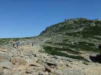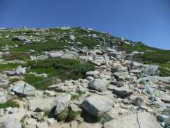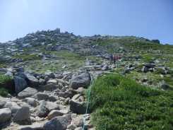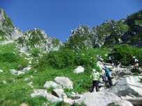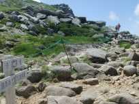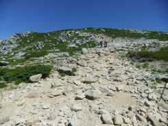 | カールの縁歩きはここまでで、この先は乗越浄土に向かって→の岩石ゴロゴロ登山道を登ります。 岩石ゴロゴロだけど、登山道はきっちり整備されているので、道が判らないとかはありませんでした。でも、岩石の高さが私のコンパスと合わないことが多かったりして…。かなり息をはずませて登り続けます。 ある程度、登っている人が列をなしているけれど、追い越したり追い越されたりの融通は利きました。 |