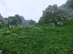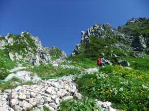 | 先に着いていた方々、一緒に着いた方々、それぞれに準備をして、それぞれの目的の山に向かって出発して行っています。 私たちが向かっている乗越浄土方向に向かう人の数が最も多かったです。 舞い上がったまま、山と空を見上げながらカールを歩いていると…雪渓登場です。 |
