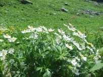 | ここが「山登り始めました」で読んだ乗越浄土への登山道なのですね〜。本で読んだ道を実体験。大丈夫、一歩一歩、ゆっくりでいいんだから。 7月下旬の千畳敷カールから木曽駒ケ岳への登山道には、色とりどりの高山植物が咲き競っています。白と黄色の花が多いかなぁ〜。 蒼い空、白い岩稜、白や黄色の高山植物。夢のような景色が、今、私の目の前にあります。これで、テンション上がるなって言われても、上がってしまいますよね♪ |