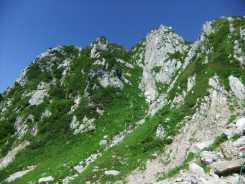 | ←巻き道と中岳へ直登の分岐。巻き道への道標にこの写真では読めないかな“危険”の文字がありました。巻き道の方が“危険”って…一体、どんな巻き道? 「山登り始めました」で、巻き道が危ないことは読んでいたので、巻き道には目もくれず、中岳へ直登します。 だって、まだまだ私たちは初心者ですから〜。 |