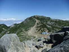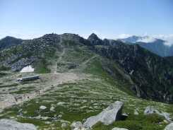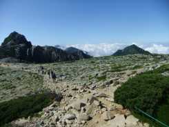 | 乗越浄土で休憩して、気持ちを引締めて中岳に向かいます。 向かうと…あれれ?…乗越浄土の休憩でバラケた人、更に中岳に向かう人の数が乗越浄土に向かって登って来た人の数から考えたら、何分の1かに激減しています。 これって、中岳・木曽駒ケ岳へ向かう人よりも宝剣岳へ行く人が多いってこと?それとも先に宝剣岳へ行ってから中岳・木曽駒ケ岳に向かうとかなのかな? |