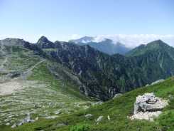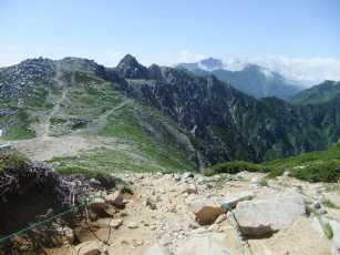| 木曽駒ケ岳に向かって、一歩一歩着実に、足元の岩石に足を取られないように進みます。 見上げると木曽駒ケ岳→。 ↓振り向くと中岳と中央アルプスの山々。 |