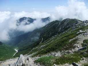 おにぎりを持つ手をふと見ると、真っ赤になっていました。しまったぁ!千畳敷駅に着いたとき、千畳敷カールの素晴らしさに心を奪われて、日焼け止めを塗るのをすっかり忘れていました!うっわ〜、両手の甲、真っ赤で痛い。ほぼ火傷状態です(涙)。はぁ〜、大失敗。 木曽駒ケ岳からの眺めを堪能しながら、ふと中岳に目をやると、下からガスというか雲が湧き上がってきて、アッと言う間に、それまで目の前にあった中岳が雲の中に隠れてしまいました。ええ〜!!この距離で中岳が見えなくなるのですかぁ!ビックリ。 |