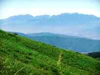 天気がいい分、気温が上がっているようで、午前中から暑い!ふわ〜。 南の方向の山々の写真を撮っていると、ふと遥か彼方にぽっかりと浮かぶ単独峰が見えます。 |