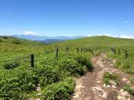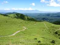 たっぷり休憩して出発。 車山から車山乗越を経て蝶々深山へ至る道は、→のような爽快な草原の道です。 嬉しくて舞い上がってル〜ンルン♪ |