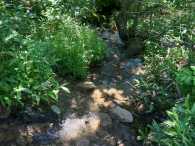| 鎌ヶ池キャンプ場は、せせらぎの小川と林の世界。 鎌ヶ池キャンプ場で休憩していると、蝶々深山にいたのとは別の林間学校で来ていると思われる中学生かな?の一団が私たちを抜き去りました。 林間学校の生徒さんたちが、がんばって歩いてくれているので、霧ヶ峰の登山道も草の勢いに圧倒されずに、その道筋を私たちに示せているのかなぁ…とか思ったりして。 |