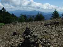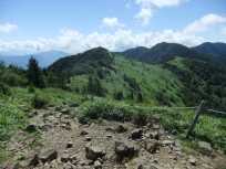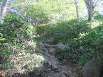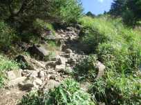 雷岩のところには、先着の方々と大菩薩嶺から戻った方々が、モレ聞こえるところによると、お互いのこの夏の山行について、熱心にお話ししあっている様子。 では、お邪魔するのも何なので、休憩せずに大菩薩嶺へ行きましょう。 |