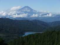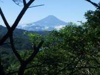 | そして、木々が切れて、展望がききそうなところで振り返れば、そこには富士山が見守ってくれています。 先程よりも、少し登ったので少しだけ写真の角度が変わっているはず…。え〜っと、先程よりも雲が増えています。このまま富士山のお姿がず〜っと見られる山行になってくれれば良いのですが…。 |
