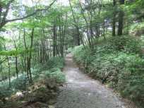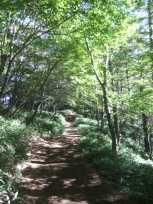 | 登山道で約30分の福ちゃん荘までタクシーや福ちゃん荘の宿泊客さんはクルマで入れるようですが、それ以外のマイカーは上日川峠の駐車場までしか入れません。 登山道は、この車道と付かず離れずのところを通っていて、多少のアップダウンはあるものの、おだやかな林の中の道でした。 |