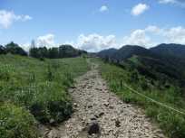 | 目の前に続く1本の道。 緑なす斜面に続く道をひたすら前に向かって歩きます。 すると、風景は、草原から一転した累々と石が転がる世界に変わりました。 |