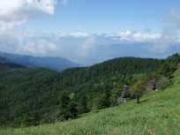 ←の写真の深緑色の木々と草原の若草色の境目の尾根にあるのが大菩薩峠と峠に建つ介山荘です。 | ||
