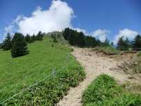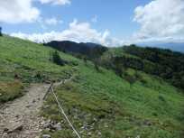 | ←の道を通り抜けると、→の草原の中を歩く気持ちの良い山稜になりました。 進行方向右手には、富士山や南アルプスの山並みが眺められます。 |