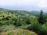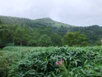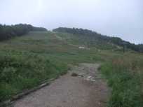 | 空もどんどん明るくなって、高度とともにテンションも高くなります。 緑の草原を抜ける道。ピンクの花の群落の脇を通る道。 たっのしいな☆楽しいな♪ |