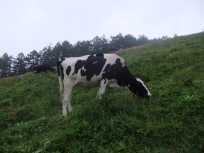 | レインウェアを装着して山歩き再開。 ほどなくすると、登山道のすぐ側で放牧されている牛さんたちが、草をハムハム。牛さんたちと私たちの間に柵はありません。ですから、結構、これが怖かったです。なぜなら、私のレインウェアは赤系。牛さんを興奮させる色…。びくびくしながら歩いて…何事もなく通れてホッ。 |