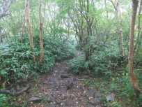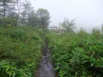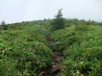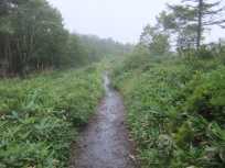 | 先客の単独行の男性と、後から来たご夫婦1組もここでレインウェアを脱いで行きました。鞍部は小広くなっているので、そういうことがし易い場所でした。 鞍部からしばらくは笹原の中の道を行きます。雨に濡れた笹の葉が身体に当たって、レインウェアを脱いでいるので、服が濡れて冷たい…。 |