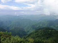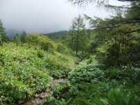 | 晴天は最後まで保ってくれませんでした。烏帽子岳山頂の昼食タイムが晴れていたので、良しとしましょう。そう思いつつ下山していると、先刻も通った鞍部付近で雨が上がったのでレインウェアを脱ぎました。天候が安定しません。 |