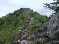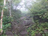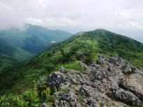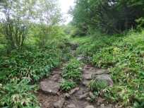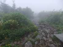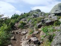| 四阿山に近いせいか、この湯ノ丸山も岩石がちの山容でした。 濡れた岩石を慎重に降りるのも一緒。こちらの方が、浮き石が多くて、その分もっと注意が必要でした。でも、四阿山の経験もあり、取りあえず足元の花々を見たり、後を振り返ったり、それらの写真を撮ったりする心の余裕はあったようです(笑)。 山頂から鞍部へは約55分。 |